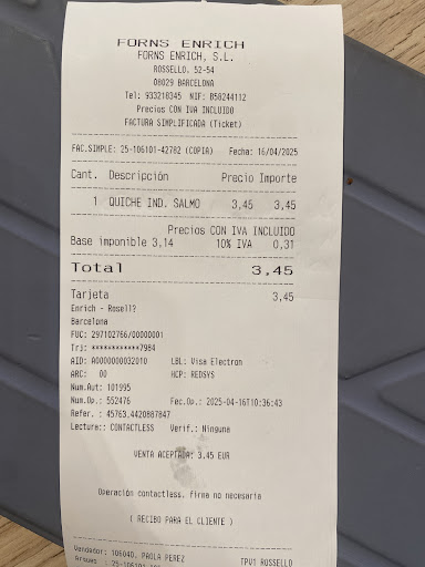 Muy bonita, mucho más amplia, más mesas para sentarse, que la anterior que estaba un poco más abajo en badal. Las pastas y el café siguen siendo frescos y ricos. Peeeero.. deja mucho que desear. La atención al cliente un fiasco. Pedimos dos formulas de desayuno con zumo. La caja se le había bloqueado y la tuvo que reiniciar ( lo entiendo, las máquinas fallan) empezaron por la otra caja a seguir cobrando a otra gente sin que ninguna de las 3 se ocupara de mi desayuno. Le pedí que me cobraran ami ya que yo estaba antes y que me tenia que cobrar la misma compañera que me había atendido? Vale pero y quien me da mi desayuno?luego me hicieron los cafés, los bocatas que yo quería ya se los habían llevado otros clientes que estaban detrás mío, tuve que volver a esperar que hagan el bocadillo. Luego le pedí hielo para el zumo, cuando se lo reclamo una vez pagado me dice la compañera( la que no iba a atenderme) el hielo se cobra. Digo bueno si no me lo cobro pues es lo que hay hace rato que se lo pedí. Muy mal. La verdad tengo claro que a este Enric no volveremos. Ni una disculpa por la tardanza, nada....