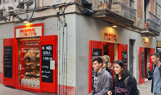 Il Forn Mistral ha iniziato la sua attività di produzione di pane e dolciumi molti anni fa, e probabilmente solo con il punto vendita di piccole dimensioni che si trova sulla Rda de sant Antoni. In seguito fu aperto il grande locale su Carrers de Torres i Amat (sul retro del palazzo percorrendo qualche decina di metri sulla sinistra) dove è possibile sia fare colazione che una pausa spuntino nel corso di tutta la giornata (con orario spezzato 7:30 - 14:30 e 16:30 - 20.30). Tutto quello che è esposto è produzione propria (pane, panificati e dolci). Avendo l'albergo a pochi metri ci siamo andati due volte per colazione e una volta per il dessert dopo pranzo. La prima volta era più che altro una prova, per cui abbiamo assaggiato un fagottino ripieno (empanada) , un mini sfilatino con prosciutto e una striscetta di pizza dolce (in strisce simili alla nostra pizza bianca), questi ultimi due venduti a peso. il fagottino costava 2,60 €, il mini sfilatino 2,30 e la striscetta dolce 0,88 (tot. 5,78 €). La seconda volta abbiamo fatto una colazione vera con due mini sfilatini con chorizo e prosciutto e formaggio (€ 5,09), una ensaimada con la marmellata (€ 2,05), due caffellatte (€ 3,40). In totale €10,54. Le consumazioni si possono fare al tavolo senza alcuna maggiorazione, nel grande locale a due piani. La terza volta abbiamo solo preso due dolci dopo aver pranzato. Abbiamo ripreso una ensaimada con la crema (€ 2,05) e un altro dolce chiamato Brac petit gitano, che è un cilindro con una mousse molto buona e all'esterno si può scegliere di vari gusti, ricoperto di cioccolato, oppure nocciola o altri gusti ancora (€ 3,04), spendendo in totale 5,09 €. Da una parte non ci sono problemi per l'ordinazione, perché molte cose hanno nomi simili a quelli italiani, da un'altra parte le commesse che ti servono hanno in genere poca pazienza con gli stranieri (secondo me sono super stressate di lavoro e il posto è frequentato per la maggioranza da locali). Sia per la qualità dei prodotti, per la grande scelta e per la comodità di sedersi comodamente quanto si vuole, ci siamo trovati molto bene e ci siamo anche ritornati. Prezzi normali in rapporto a quelli italiani (più la comodità e la clientela simpatica offerta gratuitamente ....). La ensaimada - dolce delle Baleari -(rotella simile alle nostre, ma moolto più grande) va assaggiata...