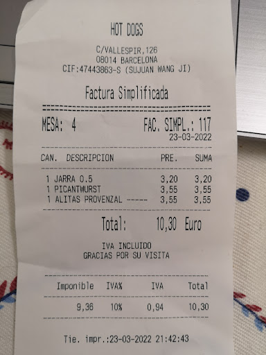 Read moreNormal hot dog place, "Frankfurt" in spanish, it's very economic, nice place to have a few beers and a quick bite. Quick staff, the place is very clean and transparent. Downsides the menu is very classic, antiquated dishes. The best part is the economic side...
