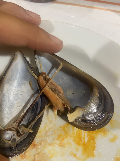 Read moreFuimos a comer 30 amigos y disponíamos de un menú cerrado de 26 euros. Para picar: Lacón con cachelos (que las "patatas tenían una pinta horrible y sabor mas de lo mismo), Patatas bravas ( buenas), Mejillones en vapor (aquí vino el primer problema , la mitad de los mejillones vacíos y la otra mitad como el de la foto, y no exagero, no hubo ni 1 correcto), éramos unas 30 personas y todos opinamos igual, y nos quejamos y con razón. Al cabo del rato nos trajeron unos mejillones en perfecto estado. ¿qué pretendían al ponernos esos al principio? Los tenían guardados para gente más selecta?? .