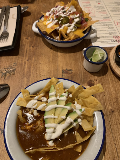 La comida tampoco estuvo a la altura. Pedimos nachos (9 €) para compartir y luego tres tipos de tacos: tacos al pastor (7,9 €), tacos de yaca al pibil (7,9 €) y birria de setas con consomé (8,5 €). Todos los platos carecían de sabor. La presentación era básica y sin gracia, pero lo peor fue la falta de potencia en los sabores. En un restaurante mexicano esperas una explosión de especias y sazón, pero aquí todo nos resultó insípido y sin alma. Además, en cada plato de tacos solo venían dos unidades, lo que por el precio nos pareció excesivo y nada justificado.