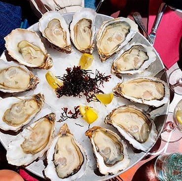Respecte al menjar. Les ostres excel·lents. Tenen una gran selecció i varietat de calibres. Molt satisfets. El pa en mantega: mantega bona "échiré" i pa d'una qualitat que no li va a joc de cap manera. Garoina, no ens va convèncer el color malgrat la seva intensitat.