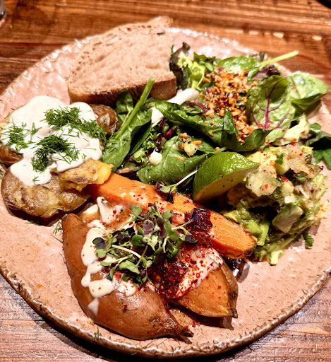 Read moreHonest Greens is a haven, an oasis, for vegans and vegetarians, very reasonably priced, with freshly prepared dishes, primarily organic, local produce, and the menu is ninety percent plant based. I ate here a number of times when I visited Barcelona, Spain, this summer (2025). Always delicious. Being vegan, it was difficult to find vegan food in Barcelona, but Honest Greens was always fresh, reliable and satisfying. They have great vegan desserts too including Macadamia Nut cheesecake! This restaurant is conveniently located, just two blocks from Plaça de Catalunya, and is air conditioned. Seating at this location is primarily at communal, long tables, shared by everyone, with lots of plants around the large windows. I recommend Honest Greens for all, vegans, vegetarians and omnivores. I hope to visit some of their other locations when I’m traveling around. A platter I consistently enjoyed, is called a veggie platter, which includes a green salad, a homemade slice of bread, and two sides for 8.95 euros. I chose sides of baked sweet potatoes, with tahini sauce, and roasted white potatoes, with a thick, and creamy, plant-based tzatziki style sauce and fresh dill. I added an additional side of really delicious, freshly prepared, chunky guacamole for 3.45 euros, and a bottomless, cold, variety of fruit infused waters, for 2.65 euros. My photo, below, is of the delicious “veggie platter”. Their philosophy is a commitment to fresh, organic, chemical free, unprocessed foods, with no preservatives. Everyone can find something delicious, fresh, inexpensive and satisfying here. And with their wholesome food principles, they are a good business to support and...