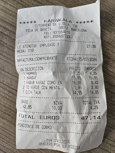 Read moreVery good Lebanese restaurant in Gràcia. My partner and I shared three starters and one main dish. The Búrak Jubne (fried puff pastry rolls filled with cheese and mint) were out of this world. The Muttábal and Karakala potatoes were also delicious. The only dish I wouldn't order again was the Maklube: it was a bit dry, lacked flavor and seemed overpriced at €13, given that it's mostly just rice, pasta and some vegetables. Other than that, I highly recommend Karakala. The service is spot-on. The interior is simple but inviting. Expect to pay around €25 per person. They also have a daily menu for €12.5 on weekdays and €14 on...