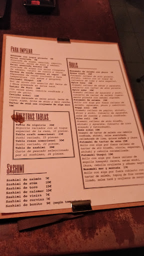 Todo el restaurante, que es pequeñito, huele profundamente a frito. Llegamos a casa oliendo a frito de cabeza a pies. A eso le llaman un gran problema de ventilación, toda la ropa a la lavadora. El personal, incluido el chef que sirve comida cruda, con la mascarilla por debajo de la nariz todo el tiempo. Creo que todos conocemos la situación sanitaria actual como para no respetarlo. Y la verdad, si que la calidad del pescado es superior, pero hemos comido unos cuantos restaurantes de nivel similar y aquí nos ha faltado la explosión de sabores en la boca, el pescado crudo y extremadamente tierno deshaciéndose completamente, a la vez que nos ha sobrado un exceso de wasabi y cierto aderezo a los nigirs más simples que no ayudan a disfrutar del sabor natural y fresco del pescado. Esta es una apreciación totalmente sujetiva, para nada la comida es mala, pero descartando todo lo demás, nos esperabamos algo mejor.