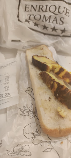 Quiero esponer mi más sincera decepción que me encontré al confiar en la persona y los productos comprados en esta ocasión el día 21 de agosto del 2023 en la barra de Enrique Tomás ubicada en la calle diputación de Barcelona. Debo decirte señor Enrique Tomás, que tus ganas de expansión del negocio, seguramente son muy rentables, pero si uno no respeta los principios que le han llevado al éxito, acaba en la decepción de sus clientes. Aquí expongo mi queja después de pedir 1 bocadillo con jamón 5 *. 1 flautin de jamón 5 *. 1 bocadillo vegetal con ventresca. 1 bocadillo de tortilla de patatas con pan de cereales. Todos con tomate cómo es costumbre en Barcelona. Pues bien mi fallo fue confiar en el señor que me atendió ya que, el pedido era para llevar porque íbamos a coger el barco para volver a casa. El resultado fue el que veis en la imágenes.