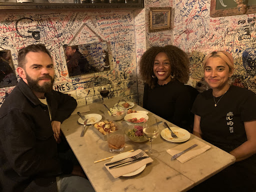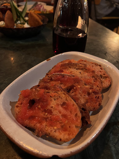 As we were unable to get into La Pepita we decided to give this sister restaurant a go. Three sittings in this tiny restaurant, 19:00, 21:00 or 23:00. I loved the wallpaper inside but all the scribbles on the walls, tiles and lamp shades were slightly off putting for my taste and the lighting isn’t great either. Nonetheless we ordered calamari, beef carpaccio with foie grass, salmon tartar, aubergine fritters with goats cheese and honey, beef stew and some foie grass with coffee and white chocolate. The calamari was spicy (unusual I thought) but utterly delicious and melted in the mouth. Beef carpaccio flavoursome and thinly sliced with “grated” foie gras- a total delight. Salmon tartar was good and on a throne of fresh seaweed. Beef stew was quite chewy and we didn’t finish it. Aubergine fritters with goats cheese, honey and apple were nice but not crispy enough on the outside which made them a bit soggy but the flavours were awesome together. The foie gras were discs of pate topped with a white chocolate mouse like cream sprinkled with coffee grinds - for me they could skip the chocolate any day and serve in its own beauty on little discs of toasted bread. Unbelievably rich and decadent. Service was ok. Our young server was a bit unknowledgeable with little personality as were the other staff who shouted over one another and there was a lot of urgency in the air as if they were to chasing the turnover of tables which I assumed it was. That in itself was off putting and we were kind of grateful to leave. Bill came to just under €100 which included a bottle of Merlot. All in all quite expensive for what it all was. I would not seek to visit again but if you’re stuck for somewhere to eat it’s worth a shot. Everyone’s views are different and you might enjoy it more...