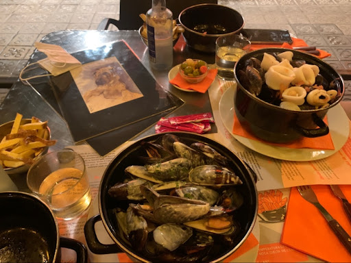 We got muscles with roquefort, with lime/lemon and a portion of squid or so.. muscles came with a side of fries. The muscles weren't debearded. Although I don't eat this food, so far I haven't seen such an abundance of muscles' beard being served. A person from my family said the quality was good and were tasty etc.. however said person got severe stomach cramps shortly after leaving the place.. won't be returning unless just for drinks outdoors.. Ps. We also got charged two portions of pan con tomato although we didn't order any.. we just payed the bill without disputing because its a small amount but still a detail of our...