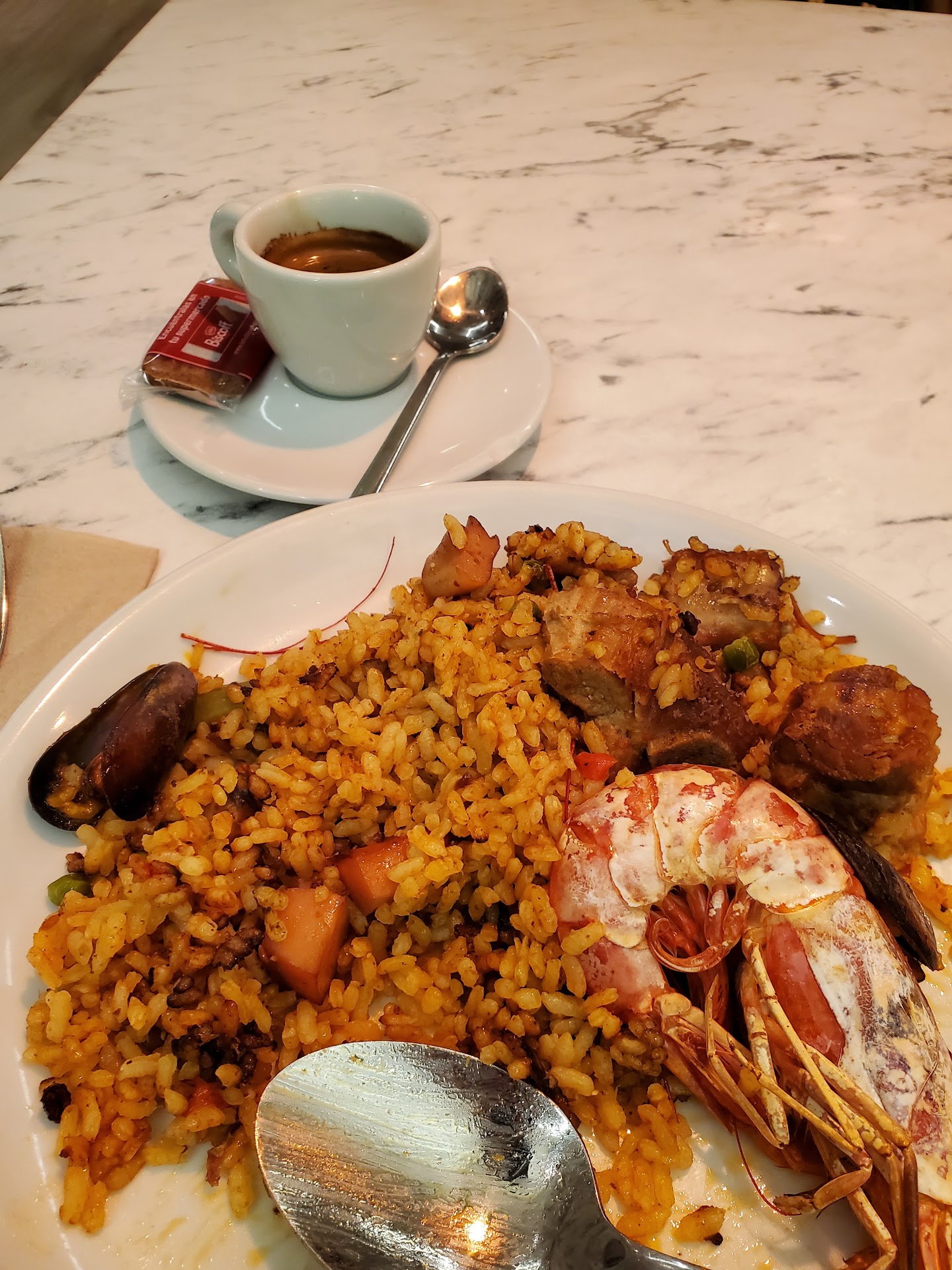 Food - the seafood paella isn't pescetarian! 😭 Lukewarm, but the staff made sure every portion had a good mix of seafood, including the big prawn. Wish they trimmed it better because I picked out many small pieces of shrimp antennas, like the top left...