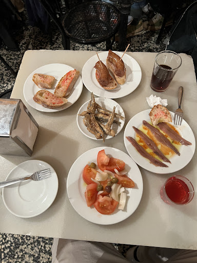 Read moreSmall, traditional bar with only 4-5 simple dishes on their menu and excellent red, white and rose wine directly from the barrel. Nothing fancy, only the joy of simple, well prepared, home-made style food, wine, beer and loud, joyful conversation. The bar is very popular among locals and is small, so be prepared for eating in crowd and during the busy hours of lunch and dinnertime, you can spot the bar easily from distance from the loud crowd gathering around around the entrance. When we first ate there we were very lucky to get a table for 5 people and 2 1year old babies sitting in our laps. We could even find a corner for the pram, but as I said, we were there early and lucky. What we ate: Fried pescaditos: the best I have eaten so far in Barcelona. Not heavy and oily (like in las Delicias at the bunkers del Carmel), excellent texture: crunchy breadcrumb and very soft fish. My one year old son with only 4 teeth could easily eat it and he loved it! Pincho with fried chorizo (sausage): lately I am not a fan of chorizzos or fat meat, but this was amazing. Perfect harmony of spices and not “heavy” at all. I think it is a home-made chorizo, they buy it directly from a farm. Pan con tomate: good Tomato and onion salad with olives: simple, home-made style and goes well with both the oescaditos and the chorizo. Amount of salt and vinegar as it should be. Simple and delicios!