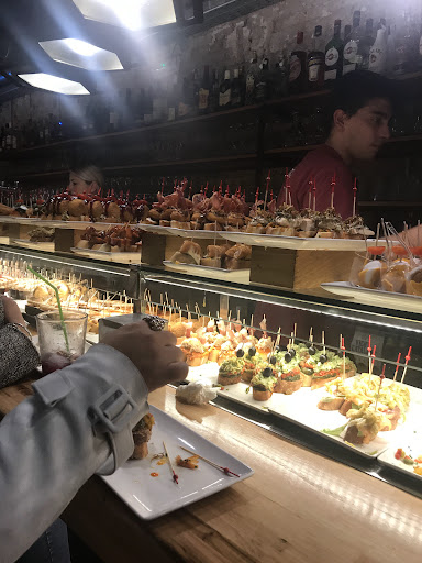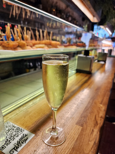 You serve yourself here - the pintxos we tried were cold, though they had hot ones coming out but were put into a queue behind glass. Maybe we were too early, and you have a better chance to get hot ones when it is busier and a higher turnover because the food would have definitely been better warmed up (I see some reviews say they can warm them up but no one offered to do this). I'd imagine it would be hard to reheat food the busier it gets. The cold mushy croquettes were my least favorite bite. Probably half of the pintxos I liked, half I wasn't crazy for and didn't finish. The best ones had meat or sausage. They did have a large selection of pintxos here. I had cava for the first time, which I enjoyed.