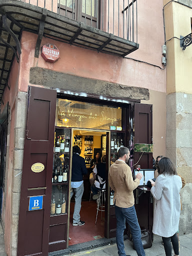 Lovely location, friendly staff, wide selection of wines, avoid the food offerings. We sat there after a long, long day, to enjoy a glass of wine or two. The location is lovely, right in the middle of a small square next to the beautiful church of Santa Maria del Mar. The place has 4 or 5 small table outside, a few stands on the wall, where people can enjoy a glass of wine standing up, leaning on the wall, and a few seats inside as well. The selection of wine and cava was very good, and one has a satisfying amount of options even on a budget. However, avoid the food offerings. We ordered a plate with a selection of 3 local cheeses, that literally had 3 tiny slices of manchega cheese, goat cheese and some sort of brie-like cheese. For 8 euro! And we dare say it was on the horrible side, as we were lucky enough to have tasted excellent manchega and goat cheese the previous days, and they came nowhere near. We also got a plate of sobrassada sausage, which was below average. I'd sit there again, but I'd only stick to...
