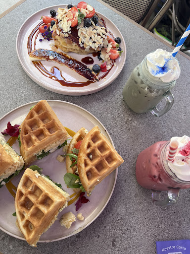 Read moreHad the most amazing time here! We came for the eras tour menu (wildest dream iced latte and lover iced latte with added shots of espresso) and left feeling like we’re in our fearless, 1989, lover, and all the happy eras 🥰 the caramelized banana pancakes were delicious and the clubhouse waffle was so yummy, the mix of danish cheese and fluffy eggs and cilantro mayo will live in my head rent free for the next couple of months. And to top it all off, Miguel took amazing photos of us and hyped us up our whole meal!! Can’t forget the best brunch partner, Mr. Bear (and of course my bestie Lia) 🧸🫶 Definitely a must visit if you’re adventuring through passeig de gracia/universitat area!
