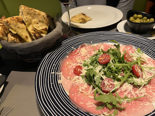 We started with a Chianti which was served with Spanish olives. Then we decided on the veal carpaccio and accepted our server’s recommendation of focaccia bread (so glad we did!).