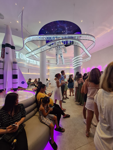 Space gelato! It's a funky vibe in here! It was absolutely packed when we went at 10pm on a Monday but things moved pretty quick. The system is interesting. You first go up to buy the size and toppings. They print out a receipt with a number then you move over to the left and wait till they call your number then they ask what flavor you want and serve you. One thing to note. We ordered 2 small cones and one medium, two with whipped cream. They charged us for 3 small cones, one medium and 2 with whipped cream. What we ended up with was the 4 cones, one with chocolate sauce and no whipped cream on any even though I made a point to ask. Not sure how they're making decisions back there but it doesn't seem like the best system. It wasn't a huge issue with us but just something to note. You need to be attentive with ordering to make sure you get what you want. Ok now for flavor review Tiramisu- solid tiramisu, has large chunks of lady fingers that were a bit hard imo, would have been nice if they had more of a coffee soaked vibe. Stracciatella- more of a vanilla with chocolate chunks. I like stracciatella to have the fine drizzle throughout. This definitely wasn't that. Kinder bueno - so good. 10/10 tastes like kinder bueno and it's so devine. Dubai chocolate - also pretty solid Chocolate sauce - I think it's Nutella. Regardless it's stupid good The cones themselves are also very good. They are heavy duty so filling the bottom with chocolate makes such a fun treat at the end. They are a little small at the mouth making it a bit hard to juggle the gelato since it's mostly rests on top rather than inside. It's still inside but it's...