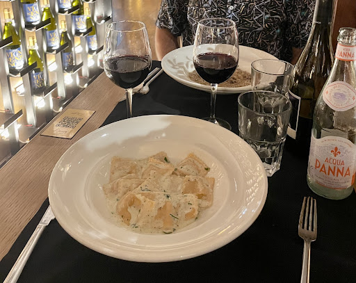 Everything we ordered was amazing. The melanzane alla parmigiana was fresh out of the oven and so tasty. The ravioli di zucca e parmigiano was also very good, and a decent portion size as far as ravioli goes. They were sadly out of coulant di pistacchio by the time we got to dessert, but the gelato di pistacchio was a good second choice. We ordered a bottle of wine (I do have to say that the wine prices were unfortunately quite high for Spain), but the cocktails looked really fun and good and will definitely be trying one next time. My only negative comment would be that our table was in a very busy and very narrow passageway with lots of servers passing through with full trays and lots of customers passing through to get to the bathroom. It was distracting and a bit uncomfortable with people almost touching our table, or lining up to wait for someone to pass through going the other way, because it was so narrow. Next time I would request a table in one of the bigger dining areas, or simply not in the passageway by the bathroom. Otherwise a very cool space.