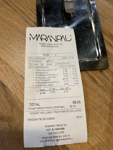 Read moreThis was a really bad experience - one of the worst in recent memory. The beers were overpriced for the size. The white wine was so warm that we asked for an ice cube, getting a state from the waitress. The ensaladilla rusa was - well, not ensaladilla rusa. Almost no potatoes, almost no mayonnaise, and âal denteâ peas and carrots. We left more than half of it and the staff did not even ask why. The calamares were cold. Full stop. The pulpo was the âbestâ of the lot, but I would not return for it either. We were still eating the mashed potatoes when two different members of staff tried to remove the plate, we said no, and the second waiter shoved it back so forcefully that it clinked against the water bottle. Appalling behaviour. Overall very disappointing, and the staff âearnedâ...