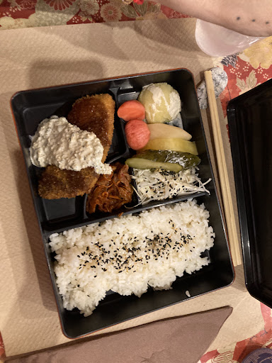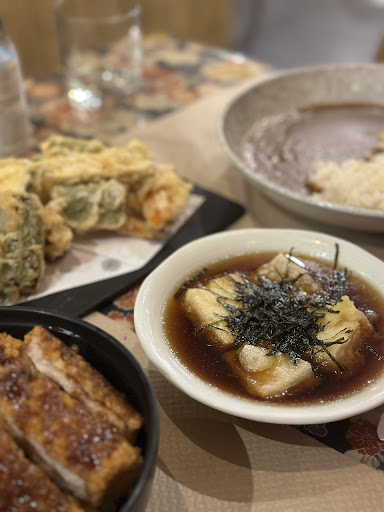 Noodle soups & rice bowls in a snug space with bamboo screens & shelves full of kitsch objects.