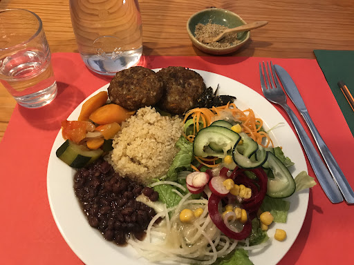 La comida está rica, consta de 3 platos. El día que fui el menú era una crema o sopa (o mezcla de las dos), un principal con ensalada, verduras, legumbres, cereal y a escoger entre albóndiga de tofu o empanada de espinacas. Y de postre compota de manzana o yogur de soja o mezcla de los dos.