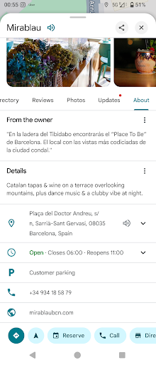 This restaurant has a perfect location, up in the hills overlooking the whole Barcelona area. It is dog friendly and we were allowed to take our hound down to the outside terrace with us. The restaurant doesn't look very big from outside but is effectively on three levels which are like terraces on the hillside. The uppermost floor is at street level with windows along one side looking out over Barcelona, the next is another indoor area accessed down stairs from the top floor. It has a bar and a few indoor tables, again with extensive windows looking over the city. The final area is down a few more steps and is an outdoor terrace with some shade. The views from here are equally impressive. On bright or sunny days, bring a shirt or blouse in case you cannot get a table in the shade - it would be easy to get sunburnt here as the breezes keep you cool even on a hot day. The menu is accessed using the 2D code displayed on the table. If features a very extensive list of tapas. We ordered drinks that arrived promptly. Our waitress was helpful and smiley (even behind her mask) and we ordered crocquets, omelette, hummus with flat bread, tomato and oil flat bread and a vegetable quinoa and vegetable salad. The hummus was fabulous and came with plenty of warm pitta. The quinoa salad was delicious and contained carrot, courgette, baby sweetcorn and tiny tomatoes, but the star ingredient was the sprouted seeds which added a lovely texture. All of the areas in the restaurant were sparkly and clean. The only potential downside is finding somewhere to park as the three (?) restaurants here are polar because of the views and parking is limited. Still worth driving up, getting your driver to drop you off and then walk back from wherever they have left the vehicle. We ended up parking a long way up the road beyond the restaurant, but the walk was well worth it. It's going to be difficult to try somewhere different next time we're in the area as we won't want to pick somewhere that's...