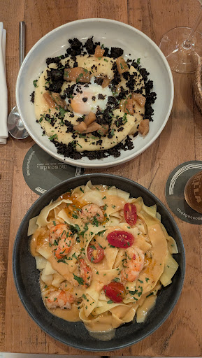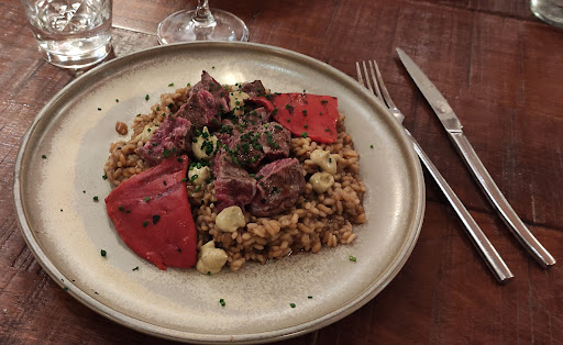 Read moreLo tenía guardado y una amiga lo propuso el otro día para cenar. Reservamos para 3 a las 21h de un viernes. Cuando llegamos no había casi nadie, asi que nos dejaron elegir entre el grupo de mesas que hay al principio para 4 comensales. Le pregunté si podíamos sentarnos en la redonda y nos dijeron que sin problema. El local tiene buena decoración, aunque personalmente me pareció muy incómoda la alfombra bajo la mesa que se enganchaba con los pies. En cuanto al baño, me pareció que estaba bastante sucio y eso que empezaba el servicio. Nos trajeron la carta y la camarera nos comentó que la mejor opcion era coger los menús. Los estuvimos mirando y la verdad que relación cantidad-precio está bien. No incluye la bebida, pero acabas lleno. Nosotras pedimos un Fuego Lento con la ensaladilla cremosa de patata con mejillones en escabeche y guindillas, que estaba correcta. Y el rosbif de ternera con salsa barbacoa coreana que no lo probé, pero gustó mucho. Como plato principal el canelón XL de carrillera de ternera y papada ibérica con setas silvestres y bechamel de cardamomo que comentó estaba algo dura la pasta. Por otro lado, cogimos 2 menús arroces pidiendo los 4 entrantes que hay: canelón de carrillera de ternera y papada ibérica con bechamel de cardamomo que no me acabó ya que tenía un sabor dulzón que no me gustó. El humus de aguacate y edamame con chips de remolacha que estaba muy bueno. Las patatas bravas eran caseras y en mi opinión faltaba un poco más de ambas salsas. Y el brioche de steak tartar que tambien estaba rico, aunque mucho pan y poca carne. La verdad que con los entrantes estuvimos bastante rato porque llegaron escalonados y había faena. Nos acabamos la primera botella de vino blanco, asi que pedimos la segunda mientras esperábamos los arroces que tardaron bastante (nos dijeron que fue porque teníamos aun parte de los entrantes sin acabar, pero tal vez lo correcto hubiera sido que nos preguntaran si traían los segundos pues las bravas que quedaron no se acabaron por ejemplo...). Por cierto, tienes un 10% de descuento en las botellas por pedir los menús. Entonces nos trajeron los arroces y al probarlos, estaban duros. Dudamos si comentarlo, pero lo tuvimos que decir. La camarera habló con cocina y nos dijo que eran al dente. Le dijimos que estaban excesivamente al dente y se los llevaron. Cuando los trajeron de nuevo, en mi caso, que era de entraña de ternera con pimiento del piquillo y emulsión de chimichurri, estaba mejor y me lo comí bien, aunque me costó acabarlo ya que se había roto el ritmo de la cena. Mi amiga, dejó el risotto de ceps con trompetas de la muerte y trufa entero ya que decía que le sabía raro. Tuvimos que pedir los postres. Entre las pocas opciones, escogimos la tarta de queso que era de gorgonzola, estaba muy buena y contundente. Pedimos la cuenta cerrando el local, ya que eran las 12h. Salimos a poco más de 40€ por persona. En cuanto a cantidad-precio bien, pero con todo lo sucedido el sabor final fue agridulce. Es una pena porque creo que tiene potencial, pero...