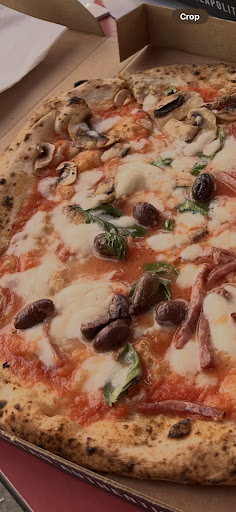 NAP is a pizzeria chain, and this is the Barcelona branch. It holds AVPN certification, ensuring some authenticity. Their pizzas resemble those from the famously uncertified Da Michele, with slightly oversized doughs, measuring around 35cm (which is on the larger end). Small differences in diameter are significant, as the area increases with the square of the diameter—so a 35cm dough is roughly twice the size of a 25cm one.