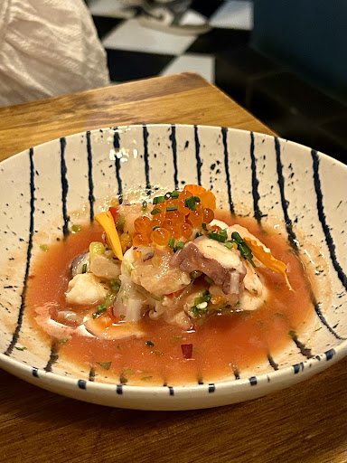 It was a Saturday night when we got into this restaurant. This place is not as popular as it shows on the Internet and we are the only customers there. We ordered two dishes, a bottle of water and a sangria ,68.5 in total. The first one is salpicon de mariscos mixtos (Mixed fish). It is an appetizer of an octopus and some little fish with a refreshing sauce. The sauce tastes exactly the same with Tom Yum Goong. We were pretty full when we entered the restaurant and this appetizer did a great job. The second one should be bacalao con compota de tomatoes (not sure) . It is grilled fish with cheese, tomato sauce and chopped scallion. The cheese on top of the fish fillet is too salty. Overall it tastes like steamed fish soy sauce. I didn’t take any photos of sangria. It is for two. Each person can drink one and a half cups of it and it costs 20. The Alcohol by volume should be pretty high though. I appreciate the food, but I still think they are overpriced. It is a place that you don't want to walk in when you are starving, in which you will only get some foods that are just enough for you not feeling hungry. If you REALLY wanna try, maybe better having some croissants before walking in.