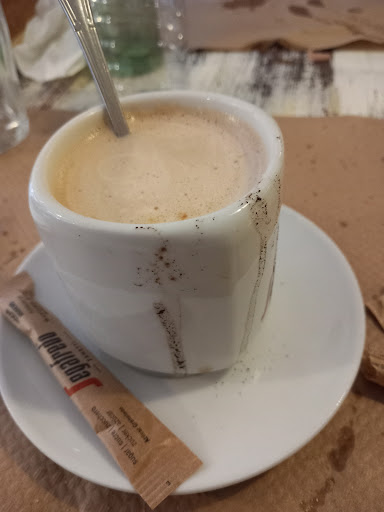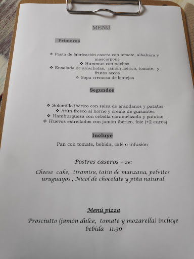Una experiencia decepcionante. Cuando llegamos, el camarero se excusó porque les faltaba un empleado y estaban un poco saturados, a nosotros (grupo de 4) no nos importó esperar y entendimos la situación. Nos toma nota, un amigo pide pizza y el resto pedimos el menú. De primero, a mi amigo le trae una pasta que estaba bien y a mi amiga y a mí nos sirve dos bols de crema con muy poca cantidad, pero el problema llega con el segundo. A mí me había recomendado la hamburguesa vegetariana porque me dijo que las hacía él y que estaban muy ricas, pero cuando la trae es una especie de humus de zanahoria servido en un plato con 6 patatas fritas (sí, eran 6 porque las contamos). Estaba rico, pero no era una hamburguesa. Le habían dado la forma de la hamburguesa pero no parecía que la hubieran pasado por la plancha para que tomara algo de consistencia, me la comí untándola en las patatas. A mis amigos les trae un solomillo microscópico de cerdo, que estaba muy seco, servido con un poco de salsa y 6 patatas fritas (también las contamos). Cuando retira la mesa nos pregunta qué tal y le decimos la verdad: la hamburguesa no se indicaba que fuera al plato y los solomillos eran pequeñísimos y encima estaban secos, las raciones en general muy escasas. Él se disculpa diciendo que le falta un camarero (no entendemos qué tiene que ver con la calidad y la cantidad de comida) y nos dice que los solomillos reconoce que estaban pasados porque la semana anterior otros comensales se habían quejado de que estaban muy crudos así que esta vez los había cocinado mucho. Nos pide que la próxima vez que vengamos le indiquemos a qué punto nos gusta la carne, pero él no nos preguntó cuando nos estaba tomando nota. Pedimos cafés (el mío llega como aparece en la foto) y pagamos. Cuando vamos a salir del local, el camarero nos hace señas para que nos acerquemos al expositor de la barra donde tiene una tarta. A continuación nos dice "mirad, un regalo para que veais que los postres son caseros". Pensábamos que nos iba a ofrecer una porción de tarta como disculpa por la cuestión de las raciones y la calidad de la comida, pero no. Coge una cucharita de café, rebaña un poquitito de tarta y se lo ofrece a mi amiga como cuando pides una muestra en una heladería. No hemos sabido muy bien cómo interpretar este gesto. No nos molestaba tener que esperar un poco más porque faltara personal, lo que nos molestó fue que pusiera esto de excusa para justificar las raciones exageradamente pequeñas, la calidad de la comida y la incómoda situación final de la tarta. Por 16€, esperábamos un poco más. Desconozco si los platos de la carta son mejores, pero no recomiendo comer de menú en este local.