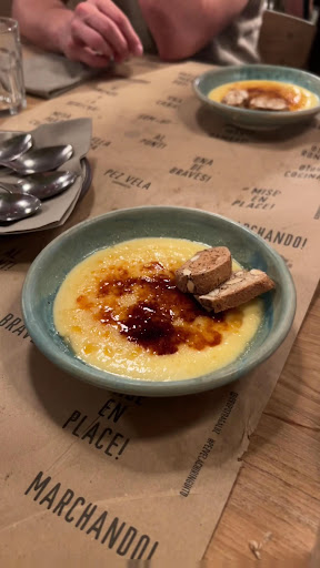 We ordered a white wine sangria, still water, spicy potatoes and one of the many seafood Paella’s. Our water was dropped off about 8 minutes later by someone who was intercepted in between tables and acted as though dropping off this water was the furthest thing from her mind. She didn’t address us or even say excuse me. It was ok. It’s water, not a huge surprise since we ordered it. WELL, the 1 liter sangria came and that was a something. The pitcher held about 600 ml, smaller than a wine decanter if you’re familiar, and they claimed it was a liter. That’s a whole different discussion. Moving on, the “spicy potatoes” tasted like sliced, deep fried au gratin with an onion reduction. Tasty, but only when you actually ate a hot one. Half the dish was room temp and the other half was piping hot, probably a station issue. We finished the app in about 10 minutes and waited another 15 before we realized that no one was going to clear our plates or utensils, not super surprising but we saw it being done to other tables so not necessarily guaranteed for us. The paella, WOW. It was definitely one of, if not the best, Paella’s I’ve ever had. We had the squid, prawn, and clam. While one could argue the “prawn” was the size of a sautéed Atlantic shrimp, the flavor was completely there. The bottom was crisp and browned, the way a true paella should be. The seafood didn’t take away from the flavor of the rice and vice versa.