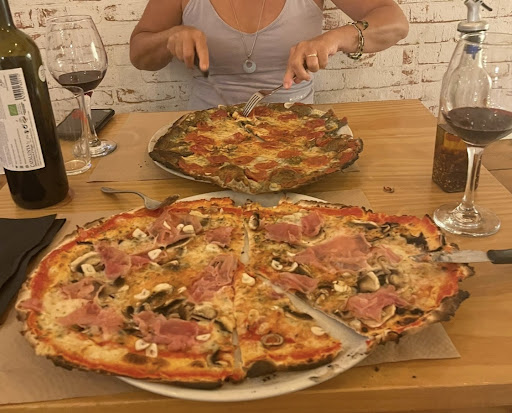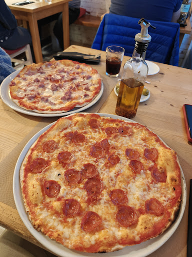 The truth is that it is not the usual pizza, for bad or good. I was not expecting to have a crunchy thin dough as base, instead of the usual bread-y one, thinner or thicker. I usually eat half pizza because an entire one is too much for me, but I ate this one in one sitting. So it depends on you how you like it. The place was full on a Thursday. The ambient is very tranquil and relaxed surrounded by plants and being situated in a square. We waited quite some time to have our two pizzas but then I saw others had them faster and maybe we had back luck to order that specific moment. Prices were ok. I give 4 stars for the good intention but for my taste and expectations it would be rather 3. Not bad...