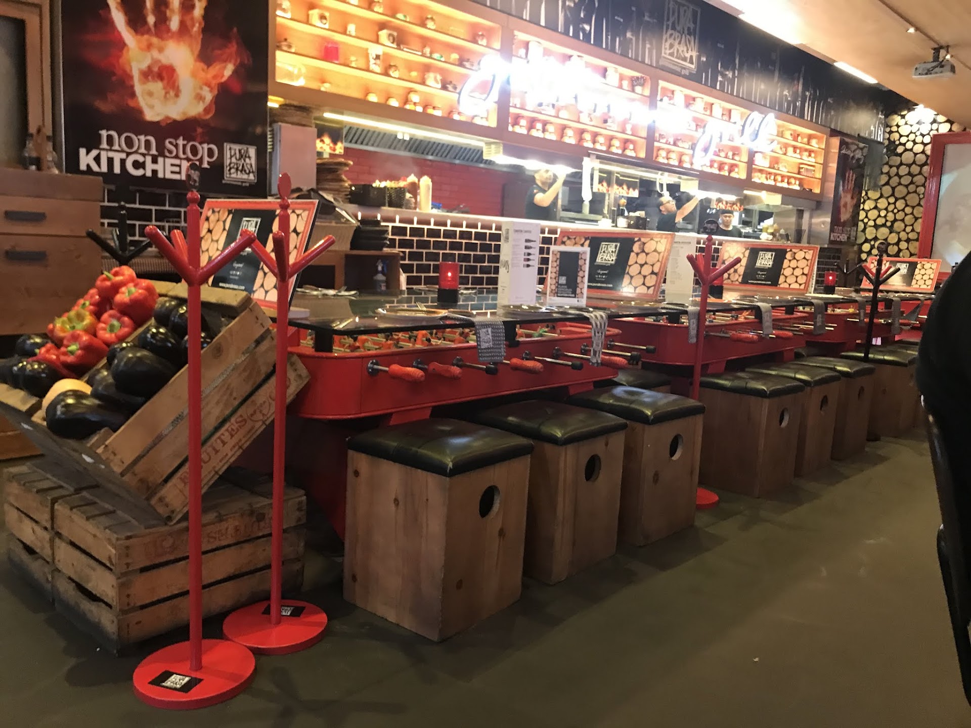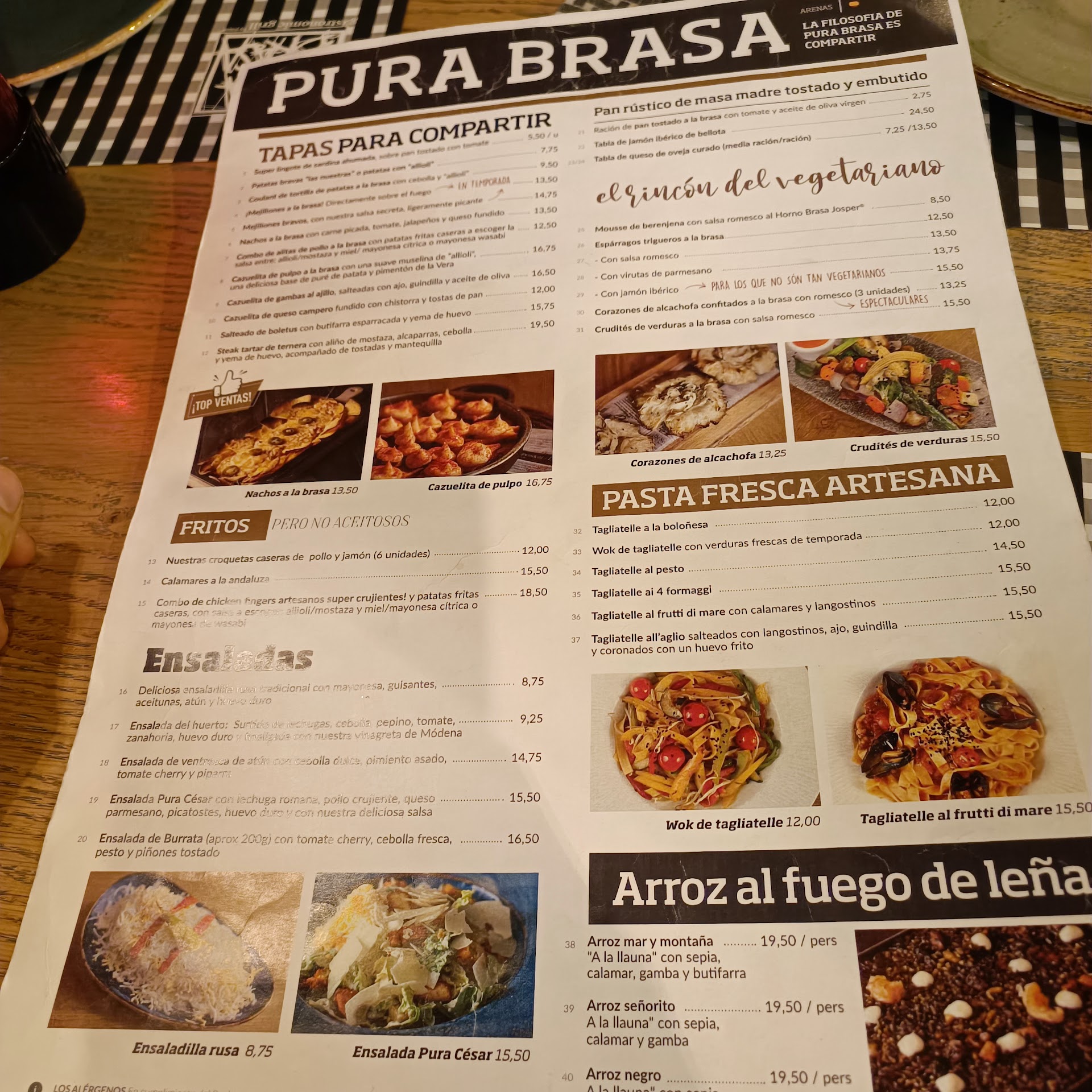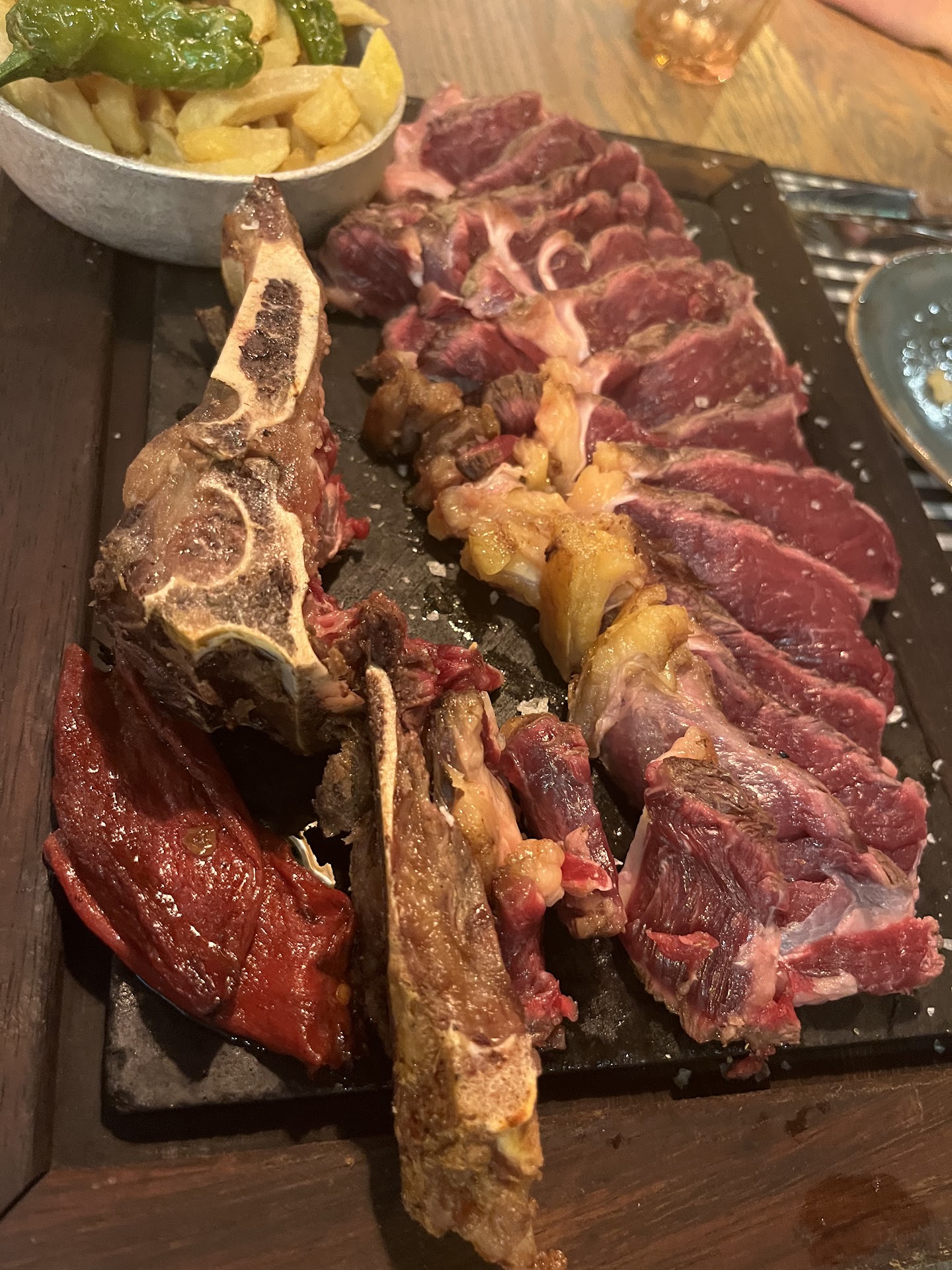 Eight of us out looking for a meal at the Bull ring Arena's Barcelona. Had gone to Tapa Tapa the day earlier and really enjoyed it there with a great drink of Bitburger lager, but they were unfortunately were full and couldn't get a table so decided to go next door to Pura Brasa, my son fancied the half-metre of barbecued ribs. My other son wanted to try the large steak for two people so we decided to share this meal. It came our on a hot platter not big enough for the job. The steak was very poor with aprox a third of it being fat, stringy sinews accompanied with a tee- bone with no meat. We tried to cook the meat but it was still all raw before the platter went cold. So I complained to the waiter after us both having tried to eat raw meat with the blood running through and soaking our ridiculously thin fries, but he thought this was all acceptable. Saying in Spain this is the meat we serve up including the useless tee-bone with no meat on it to fill your plate. I even put my hand on the hot platter and left it there to show how the platter had gone cold before it had cooked the meat, to no avail. We also had no vegetables to speak of except a few pieces of red pepper and onion.