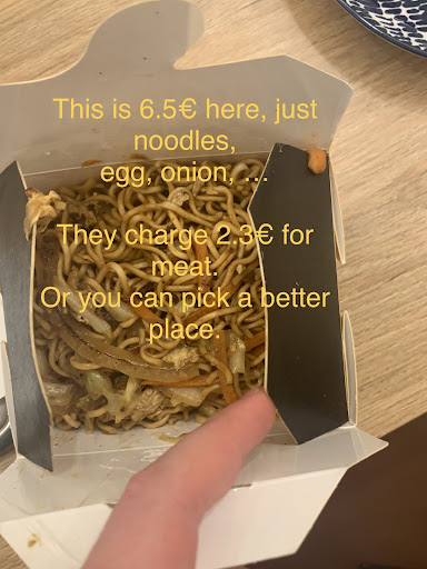 Just a few meters away, there is Canton Food 2, which has similar prices to the bases here (Pad Thai was 7€). Recommend going there instead, cheaper and nice people, much better food.