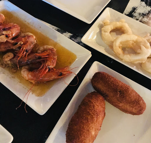 Read moreEasy walk from Hotel Sofia, next door to Starbucks. Felt authentic with Spanish servers and yummy tapas. Didn’t know the difference between the two version’s of Calamari (pictured) but the garlic shrimp was served with heads and the ham croquettes were filling. Pro: outdoor and indoor seating; great vibe; casual and not too expensive (50 euro for 2 people drinking 2 beers each). Octopus on potato was delicious. Con: no tv’s that we saw for...