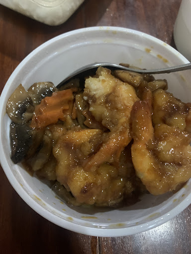 Esta fue la segunda vez que pedí el mismo plato 180. La primera vez pensé que era un error porque me llegó el plato de gambas con salsa de ostras y zanahoria y champiñones. Las gambas vienen rebozadas así que imaginaos que en la salsa se convierte en paté... ¡No se menciona de ninguna manera que las gambas llegan rebozadas! La foto del plato numero 180 (ver foto) NO corresponde a lo que recibes... El hecho es que no juzgo a primera vista. Dejé una reseña la primera vez, debería haber indicado que estaba empanizado y que le faltaban las cebollas y los pimientos rojos y verdes como en las fotos.