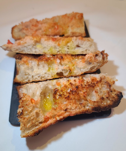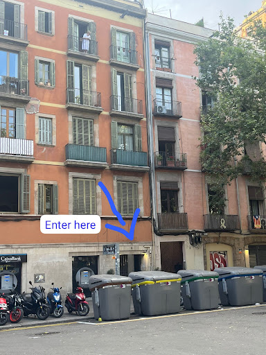 The most challenging part is to find it. We knew exactly where it was located, as simple as it gets, you take the short Carrer de l'Espaseria, walking from Santa Maria del Mar, turn right on Pla de Palau, et voilà! Yet, we couldn't find it, the reason being is that the restaurant is located inside what looks like an ordinary apartment building, with an intercom and the tenants directory. The sign on the right side of the doorway is very small and inconspicuous. You gotta enter the building hallway and reach the restaurant's entrance at its end.