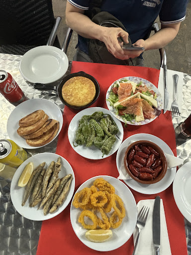 Read moreDesastre total. Al acercarnos la pinta era de "típico sitio de turistas" pero con el covid buscábamos terraza y era el primero donde había sitio. Marcaba menú 13.95, bebida y café aparte, y había arroz negro, canelones ibéricos, huevos estrellados... Decidimos darle la oportunidad. Al sentarnos miramos Google y muy buenas notas, especialmente por las croquetas y las bravas pero también hablaban bien de la paella. Pedimos huevos rotos y arroz negro para tres, también canelones y ensalada. Como tardaba decidimos probar las croquetas. Antes de empezar decidí ir al baño a lavarme las manos... No hay lavabo solo wc, ni en el de hombre ni en el de mujeres. Uso gel hidroalcohólico y esperamos. Las croquetas llegaron con los segundos platos, se habían olvidado, eso si, nos dijeron que si ya no las queríamos las retiraban. Los huevos pasados y aceitosos, olvídate de mojar la yema. El jamón poco y del barato y las papas congeladas. Este fue el mejor plato con diferencia. Llegan los canelones,secos y la bechamel cortada, ácida... Incomible. Los 3canelones secos y con sabor a jamón salado, dudo que ibérico. La ensalada con frutas era lechuga un tomate cherry aceitunas y manzana, plato correcto aunque "con frutas" uno imagina otra cosa. Y al fin... Arroz negro. Negro? Era verde. Le echaron tinta a la paella. El arroz pasado hasta el extremo, con un regusto a quemado y un tono verde ridículo. ¿En serio esta es la receta de arroz negro? Paella verde? Llegan los postres y la fiesta continua, tiramisú de supermercado en un plato, mejor pon fruta, yogur o helado que se puede entender que sea envasado pero un tiramisú de bote... Demasiado. Al final pagamos 17€ por persona por platos mucho peor de lo que nunca habríamos imaginado.