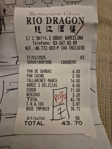 Read moreMost certainly the best Chinese restaurant in the whole of Barcelona. Home made dishes with fresh ingredients, Rio Dragon brings the best ingredients together to serve very elaborate traditional food in its highest quality. Try the Manchuria fresh noodles and also the spicy rice. You won't find any other Chinese restaurant like this elsewhere. Gang is great as well, he will give you the best advice when ordering food. This place is a...