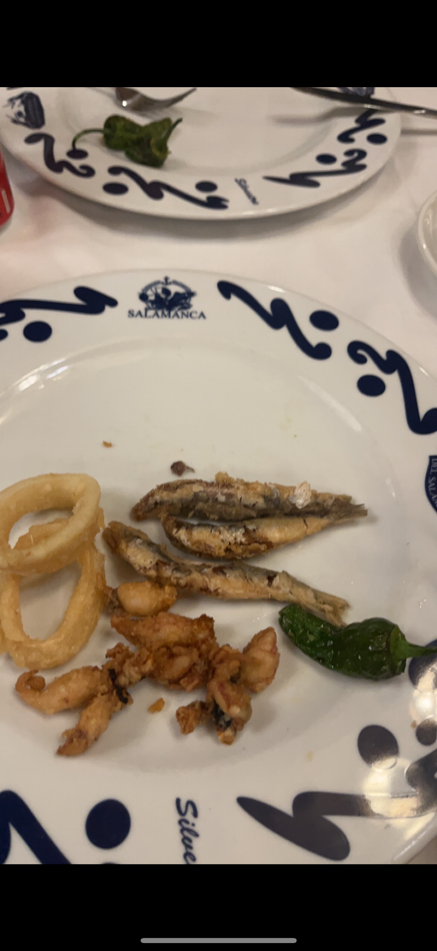 Pica-Pica (a compartir) fried sardines, calamar bebé, Calamares a la Andaluza Pimientos del padrón Excellent | ✩ ✩ ✩ ✩ ✩ Next, we shared the Pica-Pica (a compartir), a platter filled with fried sardines, baby calamari, Calamares a la Andaluza, and Pimientos del Padrón. The variety was a great way to start the meal, offering crispy, tender bites that were bursting with flavor. The Pimientos del Padrón, in particular, were a crowd favorite, with their slight smokiness and mild heat providing a perfect contrast to the seafood. This appetizer was the ideal complement to the paella, and it truly set the tone for an exceptional meal.