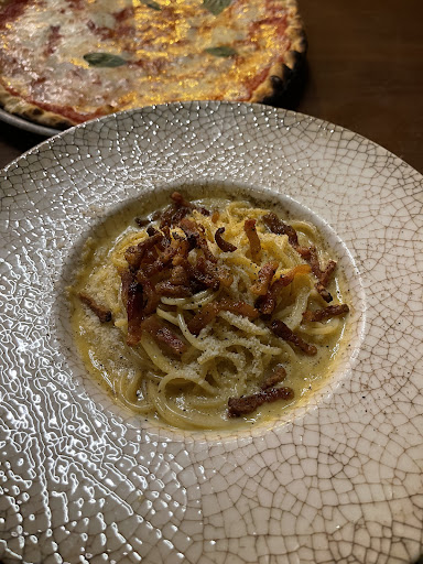 BEST CARBONARA EVER!!! I went here recently for a date with my partner. We found this place by accident and both left feeling so happy that we'd found it. The staff were so helpful, friendly and accommodating. Then a lady who I think may be the owner came and talked to us and thanked us so much for coming. She cared so much of what we thought of the dishes and told us all about the organic flours used in their dough. Everyone we spoke to had a real passion for the food and the place in general. I had the thin and crispy pizza which was amazing. Of I was being fussy, I'd like it cooked for a min longer to crisp up the base a little but I ate itas would eat it again every day. For me though, the spaghetti carbonara was the best I've ever had. I've been to Italy and all around the world and love a good carbonara. This was absolutely perfect. Fresh ingredients. No crème. Rich with egg yolk and Parmesan and real guanciale. I could not cook it better myself (and I’ve tried 😅) I'm going back tonight with friends and I've saved the location for all my future Barcelona trips. I suggest you do the same