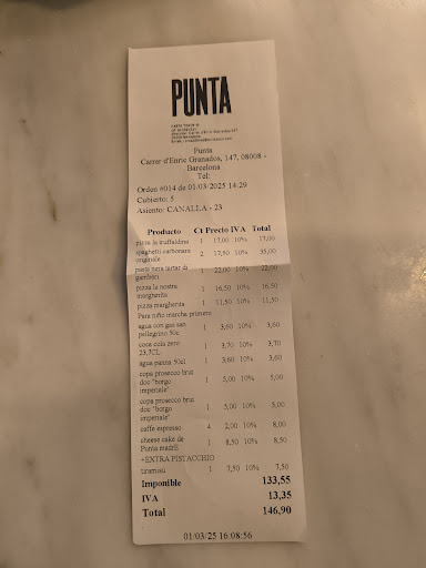 Estaba todo bueno pero nada destacaba como tal. Barcelona está lleno de restaurantes y pizzerías italianas y sinceramente Punta me pareció correcto pero con nada reseñable más allá del local instagrameable para las fotos.