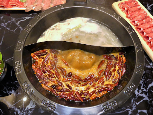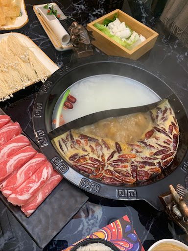 This place was such a let down 👎🏼 I’ve been to many hotpot places across the world, and this is definitely one of the worst ones. Simply because the soup was flavorless. The sichuan mala soup was basically just spicy water, since I couldn’t taste other herbs or seasonings. It was literally bland. How could you also have a bland pork broth soup😭 i almost never use sauce to go with my hotpot normally, even in HDL, but this one i definitely just had to. And even then, the taste was still “meh”. Honestly, they even charged us for EACH sauce. Like..? One plate of sauce cost like 3.5 eur and I find it amusing. In the end, we had to pay significant amount of money for something thats totally not worth it. The only good thing about the food is that the beef was good. I don’t mind paying a lot for good food and this is definitely not the case haha. Thanks anyway, but i don’t recommend and i won’t...
