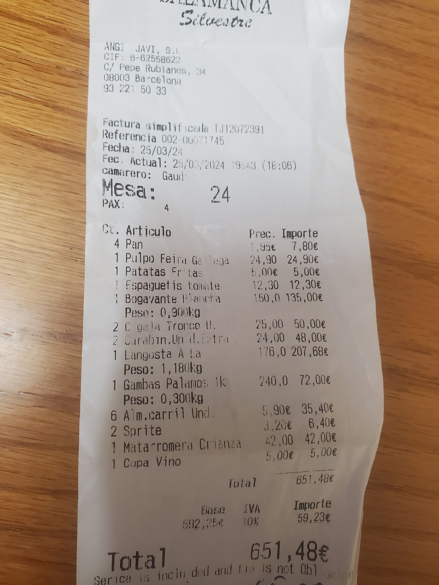 As you probably guessed the meal price was really crazy. (€ 650 ). With tip and conversion it was nearly $800. I have never spent that much for a meal before in my life, and certainly wouldn’t desire to. The waiter stood there carefully pointing out gratuity was not included and watched me closely…clearly expecting a tip. I did add a tip to the bill but looking back on it I wished I hadn’t because it felt like we were not given a good opportunity to understand what was being brought and how much it would cost us. The big lobster for my 7 year old was € 200 just itself. (who would expect to deliver that as a meal for a 7 yr old and that she would eat it all?). Embarrassingly, the 4 of us know Spanish so we can’t reasonably say it was a language issue either. After thinking about it the next day I felt a bit embarrassed and taken advantage that I should have pushed back more clearly up front what the prices of the items were and what was actually being ordered and cooked for our family. I do therefore take some responsibility in the expense for not giving the waiter more boundaries.
