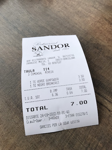 Lo más chocante ha sido el ambiente general. En lugar de un espacio tranquilo con música de fondo que invite a la conversación, había un grupo de seis camareros entre la barra y la sala bromeando en voz alta entre ellos, usando expresiones y gritos que desentonaba totalmente con lo que uno espera en un lugar como el Sandor. Aclaro que mi comentario no tiene que ver con su procedencia (he reconocido acentos colombianos, venezolanos y cubanos), sino con la falta de profesionalidad en el trato y la atmósfera creada, impropia incluso de un bar de barrio. En comparación, en el Bar Manolo se respira más calma.