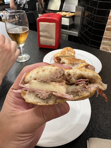 We were not particularly hungry so we decided to make a quick stop for a sandwich and their menu of the day which sounded like a good deal for 12 euros (starter, entree, drink and dessert). However, we were met with a surprising amount of attitude when we mentioned that we only wanted to order 1 big sandwich and a menu set to share between the 3 of us. We were even told that we were not allowed to have our water bottle out, as they did not want us drinking our own water. During the meal, the waitress kept shooting us mocking looks from across the counter, which is not the way guests should be treated. The food itself was nothing spectacular but it was definitely filling.