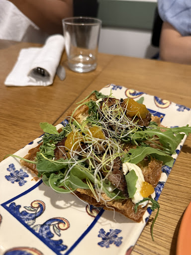We had a great salad with gourmet greens, brie, raisins, and nuts. The mushroom wontons were great and the truffle cream for dipping was even better. The patatas bravas were artfully presented, crispy, and with both a mild and a spicy sauce. I didn't care for the spicy Asian BBQ ribs but my date loved them. For dessert we chose the warm brownies, two per serving, with fresh cold whipped cream. As another reviewer here described them, they were slightly crispy on the outside while soft and tender inside. They reminded me of Katherine Hepburn’s brownies, if you are familiar with that famous movie star’s recipe.