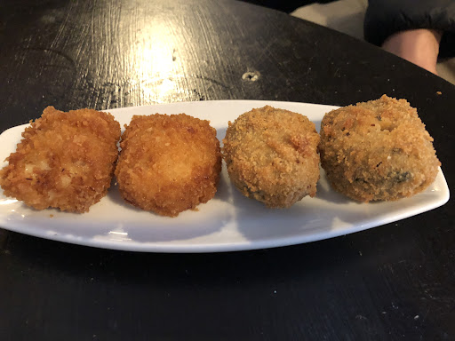 The server came and gave us a stand with a number. We ordered: Bomba - aka massive ball croquette with some sort of meat, potato with sauce. Amazing! Patatas Bravas - perfect if you like a little hot spice Morro - Deep fries pork - tastes like chicharron Mini Croquette plate - supposed to be 5 pieces but we were lucky and got 6 (mushroom, fish, cheese) Calamari croquette and shrimp and merluza croquette. One of the croquettes was still cold in the middle.