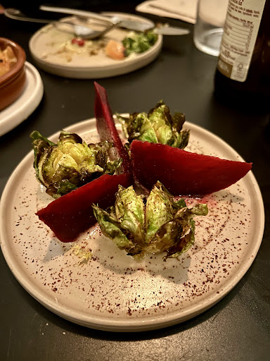 Read moreMy husband and I made a reservation for this restaurant for 7pm. The restaurant had just opened when we arrived so we were the only ones there. The waiter sat us down in what felt like a hurried manner and proceeded to slam the big chalk board stand (the one from outside) in front of us. He went over the items on the chalk board in a very ‘matter of fact’ way then asked us what we wanted. We went for the 25 euro a piece taster menu which we had heard good things about. Once the waiter left with our order, we almost decided to leave just based on the weird vibes and negative first impression we got from the weird presentation of the menu - why not have proper menus for each table for guests to take their time to look over? The food started coming and for the most part it was good but nothing to rave about. One course was a few boiled potatoes on a plate with a side of hummus and something else but it was hard to believe that this was a ‘chef selection’-good but not quality. We really enjoyed the cold soup, the chick pea curry, and the desert. The green peppers were pretty good but seemed a little simple with how they were cooked and the seasoning and there was a dish with veggies and cheese that we did not enjoy because the cheese was very much like the kind you put on cheap pizza. Overall it was a decent experience but I would recommend other places before this one based on the service and inconsistency of food quality. I suggest the waiter of the restaurant who brings in the big menu board to come up with a nicer strategy for a better first impression. It made our experience awkward and we just cringed as he proceeded to do the same thing to the other customers who trickled in. I hope this review is helpful to both potential customers and the restaurant. I mean not to insult but I do think it’s best...