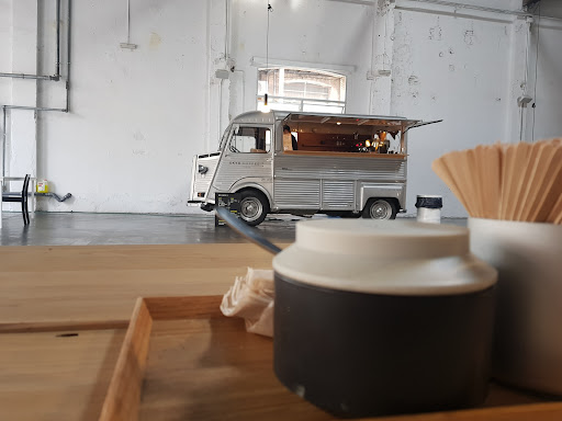Minimalist cafe doling out barista-made brews from a vintage truck in a converted warehouse.