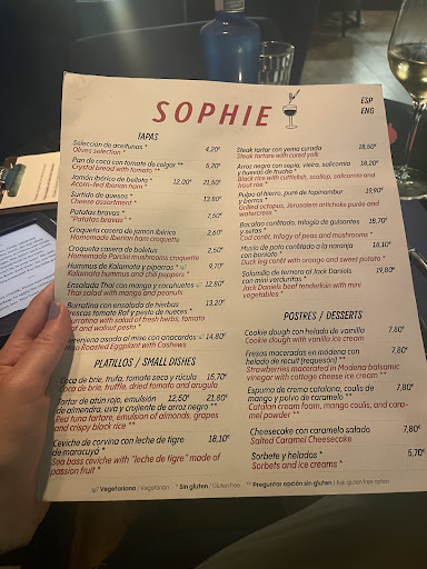 Read moreI am not one to usually leave reviews, but I heavily rely on them. For Sophie's I will make an exception. The service, 10/10. I was quite nervous walking in since my Spanish isn't so great. However that became a nonissue, because I was greeted with such warm hospitality and was able to perfectly communicate with the host and servers. The food was perfection. My family and I ordered a variety of tapas to whet our appetite. They were all delicious but i have to give special shout outs to the tuna tartare, the octopus and the molten chocolate cake (coulant de chocolate)with vanilla ice cream. The tuna was so fresh and buttery. The octopus was extremely tender and with that puree, chef's kiss! The pièce de résistance though was that molten chocolate cake with vanilla ice cream. Perfectly decadent, but not too sweet. The liquid chocolate poured through as soon as we ran our spoon through. And that ice cream, wow! It was covered in crunchy bits that added the perfect texture to the perfect dessert. I will be thinking about that dessert for...