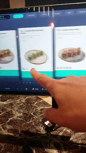 Nos pasamos la cena pendientes de la tablet para pedir, lo que me parece horrible tener que estar en una cena con los ojos pegados a una pantalla, porque los camareros solo se acercan para traerte los platos. Total que el servicio lo haces tu.